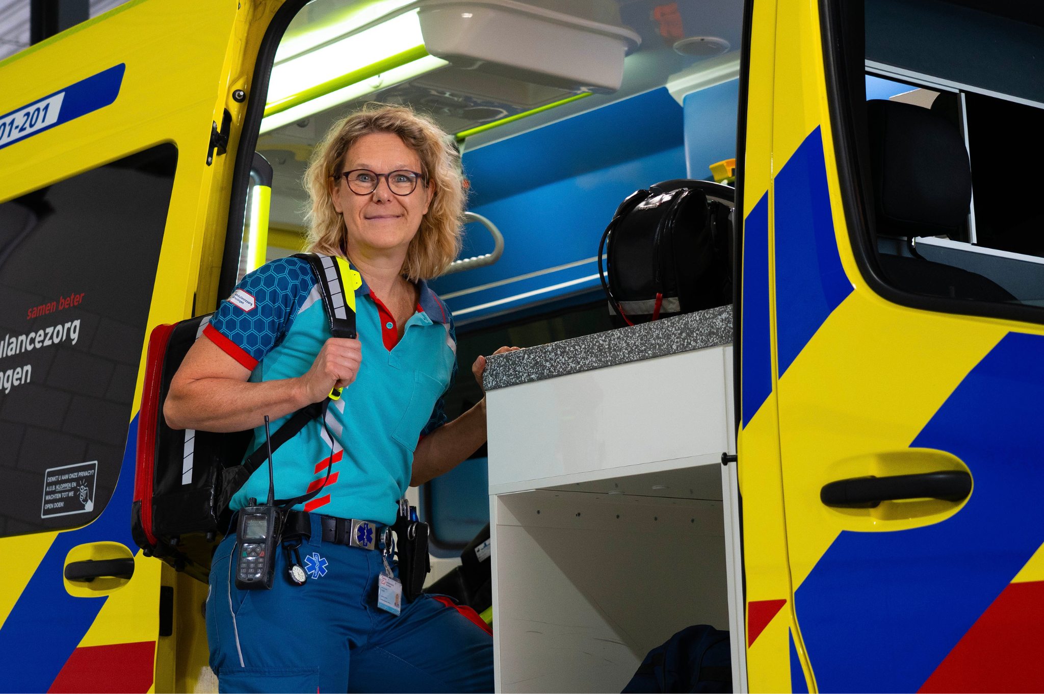 ‘Wat ik geweldig vind, is dat wij heel veel tijd hebben voor onze patiënten. Ik ben altijd benieuwd naar het verhaal van mensen. Patiënten zijn bij ons in de wagen vaak op hun kwetsbaarst. Dat maakt het contact dat je met ze hebt soms vrij snel intens. Mensen leggen heel snel hun hele hebben en houden op tafel. Dat maakt ons werk heel mooi, maar soms ook best zwaar. Je moet daar wel mee om kunnen gaan. Zelf neem ik niet snel dingen mee naar huis. Als een patiënt de deur uit is ben ik het vaak al kwijt. En anders hebben we het er nog even over in de auto of doen we de muziek hard aan en zingen we keihard mee. De enige casussen die ik wel eens meeneem, zijn die waarin ik aan mezelf twijfel, wanneer ik reflecteer op mijn eigen handelen. Er zijn echter altijd patiënten die je langer bij blijven. De jonge mensen, een vader met een jong gezin, die je palliatief naar huis brengt, een jonge moeder die niet weet of ze de eerste verjaardag van haar kind nog mee gaat maken. Dat zijn momenten waar zoveel emotie bij komt kijken. Daarom is, net als bij de spoed, ook op onze afdeling de nazorg goed geregeld. Als we bijvoorbeeld twee terminale patiënten achter elkaar hebben vervoerd, vraagt de meldkamer even hoe het met ons gaat, en of er nog behoefte is aan eventuele nazorg van het BOAG (Bedrijfsopvangteam Ambulancezorg Groningen). Het is fijn dat daar oog voor is en het zorgt er ook voor dat je het gevoel hebt er als organisatie samen voor te staan.’